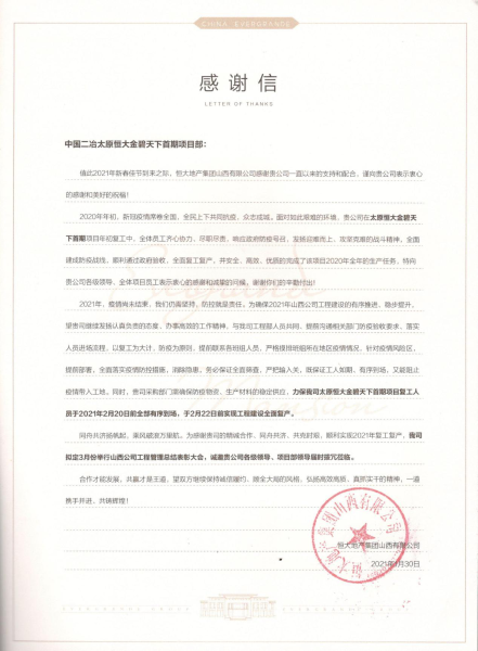 感謝信中指出,2020年初,中國(guó)二冶在太原恒大金碧天下首期項(xiàng)目復(fù)工復(fù)產(chǎn)中,全體員工齊心協(xié)力、盡職盡責(zé),響應(yīng)政府防疫號(hào)召,發(fā)揚(yáng)迎難而上、攻堅(jiān)克難的戰(zhàn)斗精神,全面建成防疫戰(zhàn)線,順利通過(guò)政府驗(yàn)收,并安全、高效、優(yōu)質(zhì)地完成了該項(xiàng)目2020年全年的生產(chǎn)任務(wù)。為確保工程建設(shè)的有序推進(jìn)、穩(wěn)步提升,公司發(fā)揚(yáng)了認(rèn)真負(fù)責(zé)的態(tài)度、辦事高效地工作精神,希望公司確保防疫物資、生產(chǎn)材料的穩(wěn)定供應(yīng),力保太原恒大金碧天下首期項(xiàng)目復(fù)工職工能夠在節(jié)后有序到場(chǎng),按期實(shí)現(xiàn)工程建設(shè)全面復(fù)產(chǎn)。