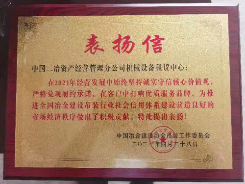 表揚信指出:中國二冶資產(chǎn)公司機械設備租賃中心在2021年經(jīng)營發(fā)展中始終堅持“誠實守信 合作共贏”核心價值觀,嚴格兌現(xiàn)履約承諾,在客戶中打響優(yōu)質(zhì)服務品牌,為推動全國冶金建設吊裝行業(yè)社會信用體系建設、營造良好市場經(jīng)濟秩序做出了積極貢獻。