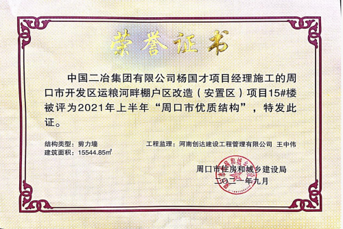 10月14日,由中國二冶新型建筑分公司承建施工的周口市運(yùn)糧河畔棚戶區(qū)改造(安置區(qū))項(xiàng)目15#樓被評(píng)為2021年上半年“周口市優(yōu)質(zhì)結(jié)構(gòu)”工程獎(jiǎng)。